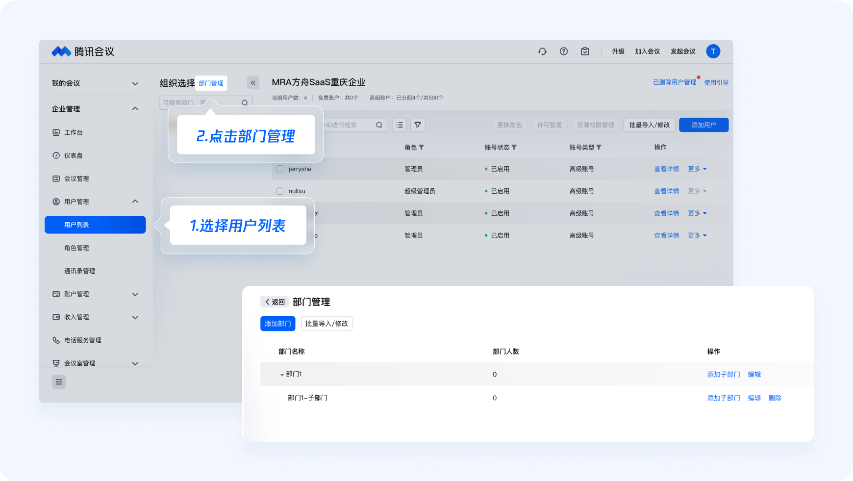 ● 超级管理员:超级管理员拥有访问和管理企业账户的全部权限。