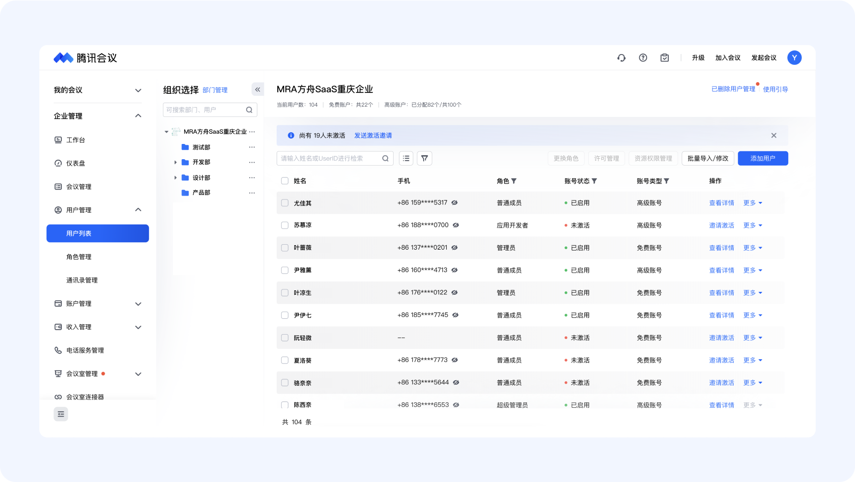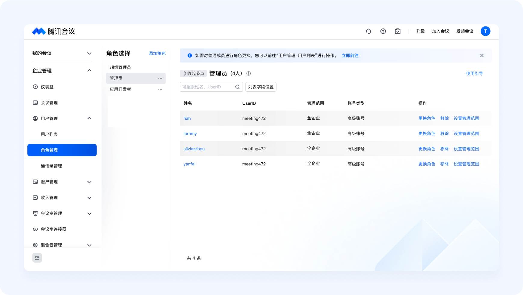 企业管理员能够对已纳入企业组织管理的成员进行角色分配,腾讯会议给予了多种默认角色:超级管理员、管理员、应用开发者、普通成员。