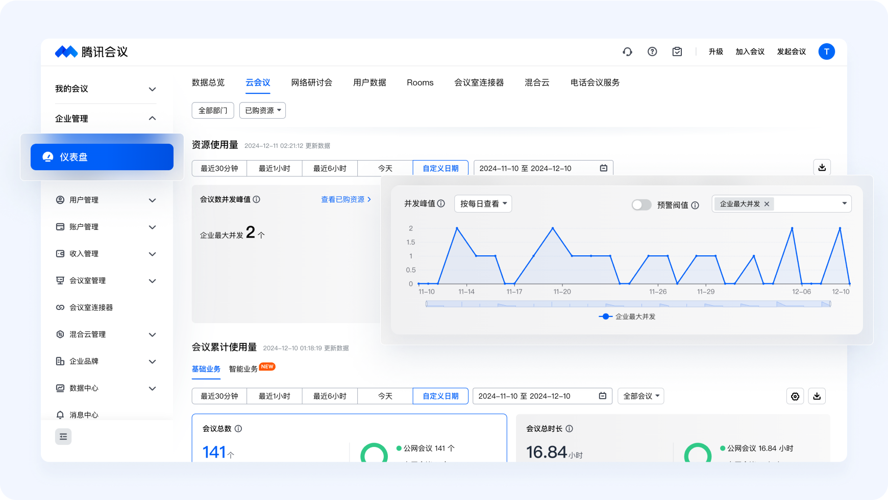 腾讯会议为管理员给予专业的可视化仪表盘,将企业所有的会议资源的使用情况进行统计分析,并以图表的形式呈现,以便管理员更好地查询、管理会议资源。