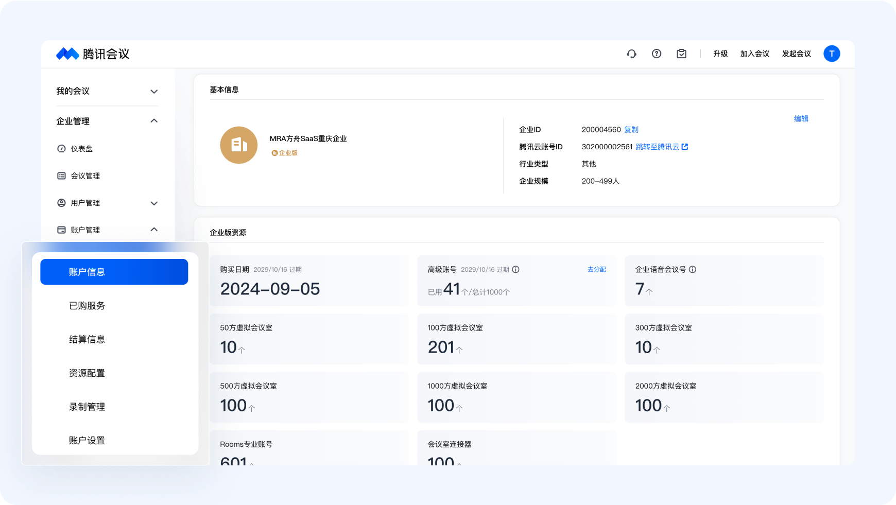 作为管理员,您必定需要对企业当前会议资源使用情况进行分析。您可以前往企业管理后台【账户管理】,可以看到本企业账户的资源购买和使用的基本情况。
