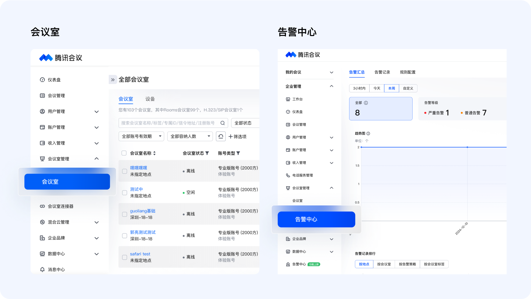 在企业管理后台-【会议室管理】中,您可以添加本地会议室,并配置Rooms账号,以便实现统一管理。同时,企管后台为您给予告警中心,按需配置不同的规则后,在会议室异常情况下,会向您发出告警,助力您快速解决问题。