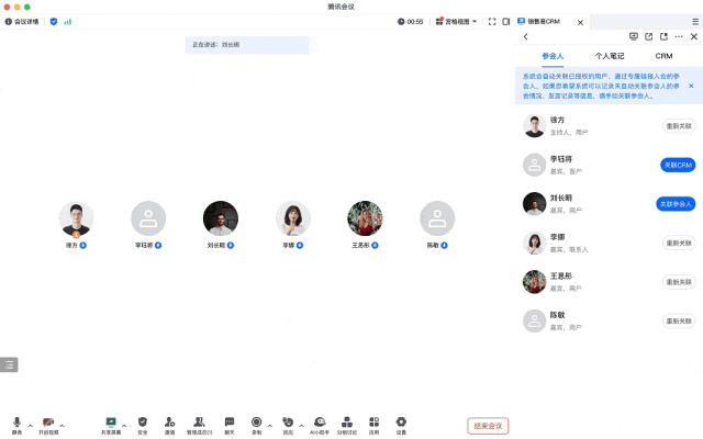 面对客户的重重提问,小会同学开始在脑中疯狂回想,尴尬地请客户稍等,并在CRM中搜索历史拜访该客户的活动记录和客户工单......一场会结束,又是一身冷汗,怎么办?现在,就简单多了!可以在腾讯会议侧边栏中看到顺利获得专属链接入会的客户标识,临时入会的新嘉宾也能一键关联CRM,以便销售快速分析到谁参会了谁没参会、谁表达了支持谁表现出犹豫......