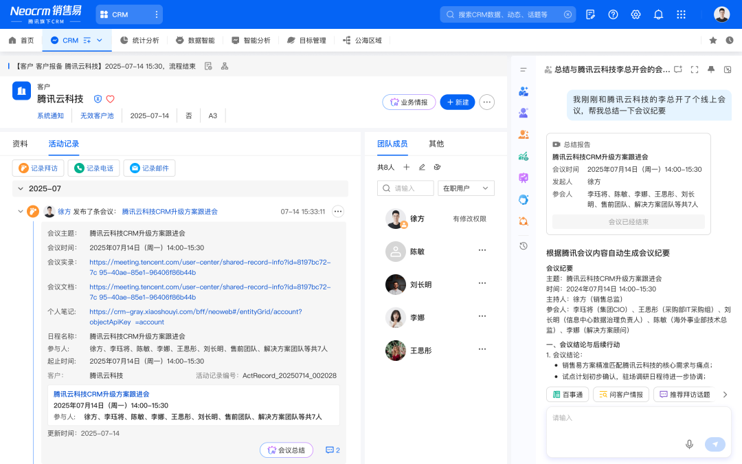 小会同学游刃有余的开完了会,又想起繁杂的会后环节:还要整理会议纪要,还要录入到销售易CRM客户360数据中,还要及时输出会议结论拉动内部各部门的同事。