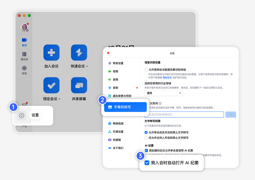 点击“设置”,选择“字幕和转写”选项,滑动至最底部,勾选“我入会时自动打开AI纪要”选项,设置完成入会后将自动为你开启AI纪要。