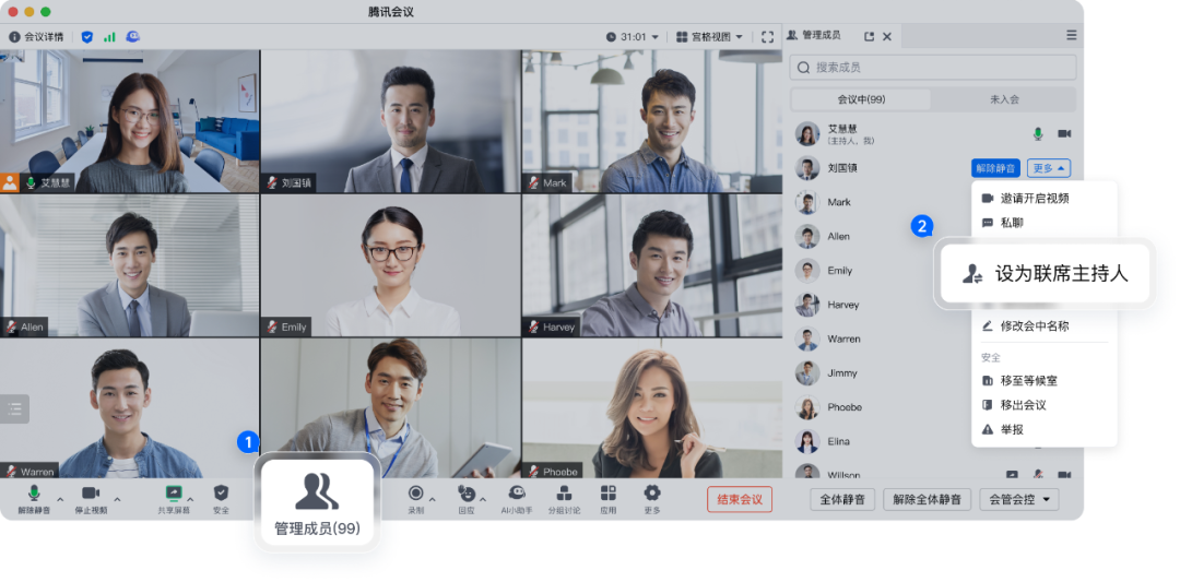 另一方面,商业版每场会议,支持最高10位联席主持人,拥有主持人同等权限,可以对参会者的开关麦、视频以及其他协作权限进行管控,并审批等候室中的人员,让大型会议也井然有序。