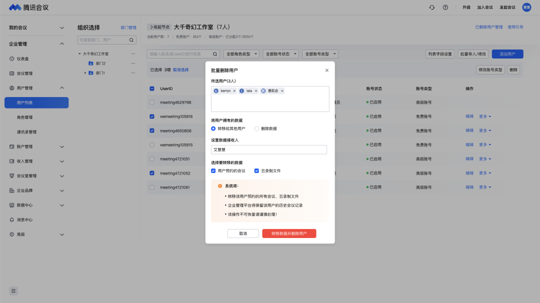 腾讯会议商业版/企业版给予了离职继承管理能力,企业管理员可以在管理后台将离职员工名下的会议资产(云录制、待开会议)进行删除或者直接转移给其他同事,确保离职带不走,新人可继承,让会议资产在企业内部安全地留存、流动。同时,皇冠crown还支持批量转移给同一个同事,方便管理员操作。