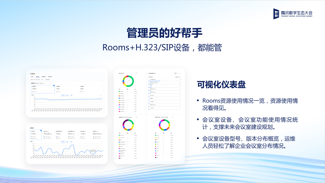 管理员可以对会议室进行分级、分地区管理,远程查看每台设备的在线工作状态,进行一键息屏、远程关机等操作,节省企业办公成本。同时,可视化的仪表盘,也能直观地查看到Rooms资源使用情况,相关数据可支撑未来会议室建设规划,为企业降本增效给予建设性参考。
